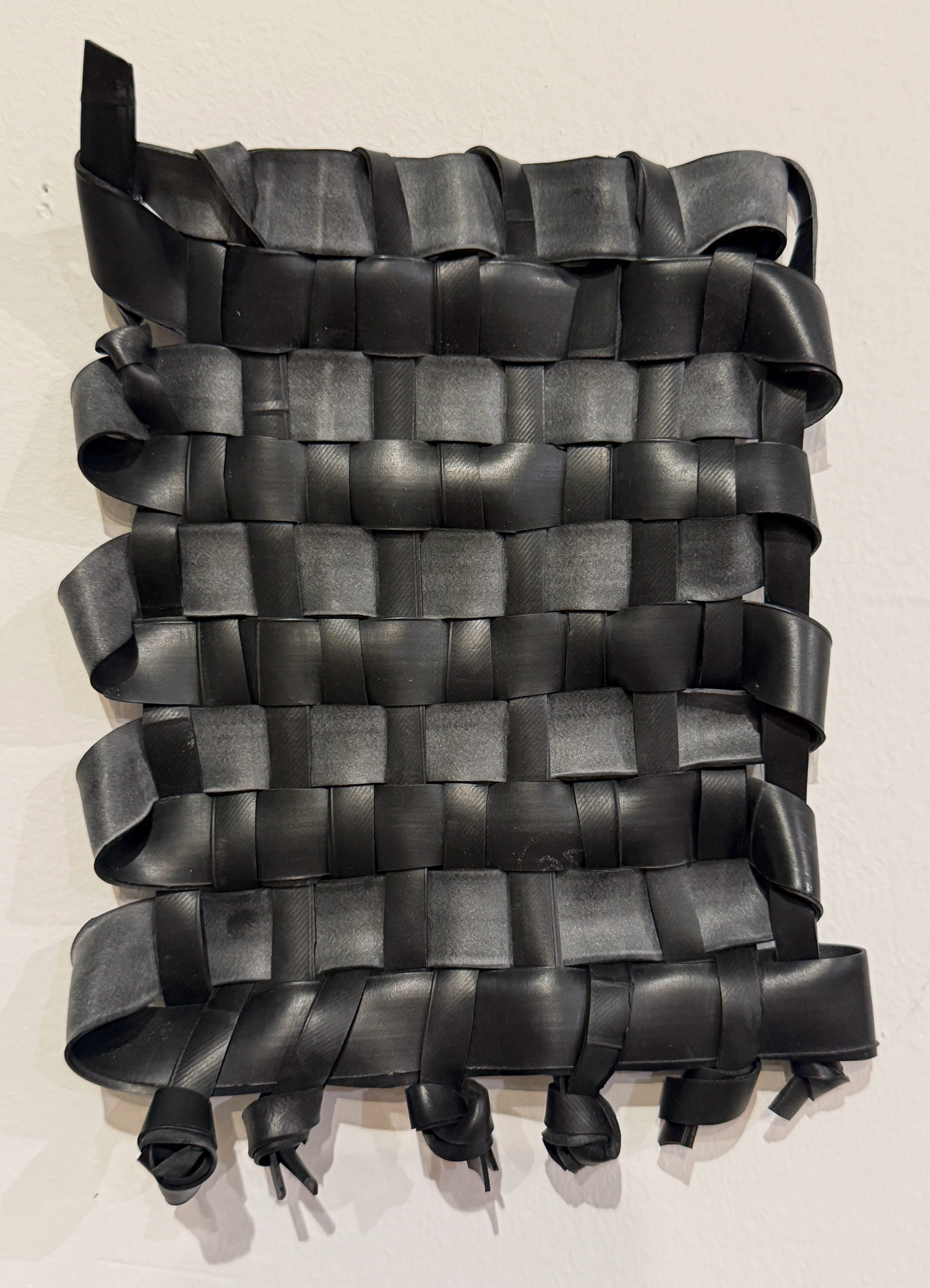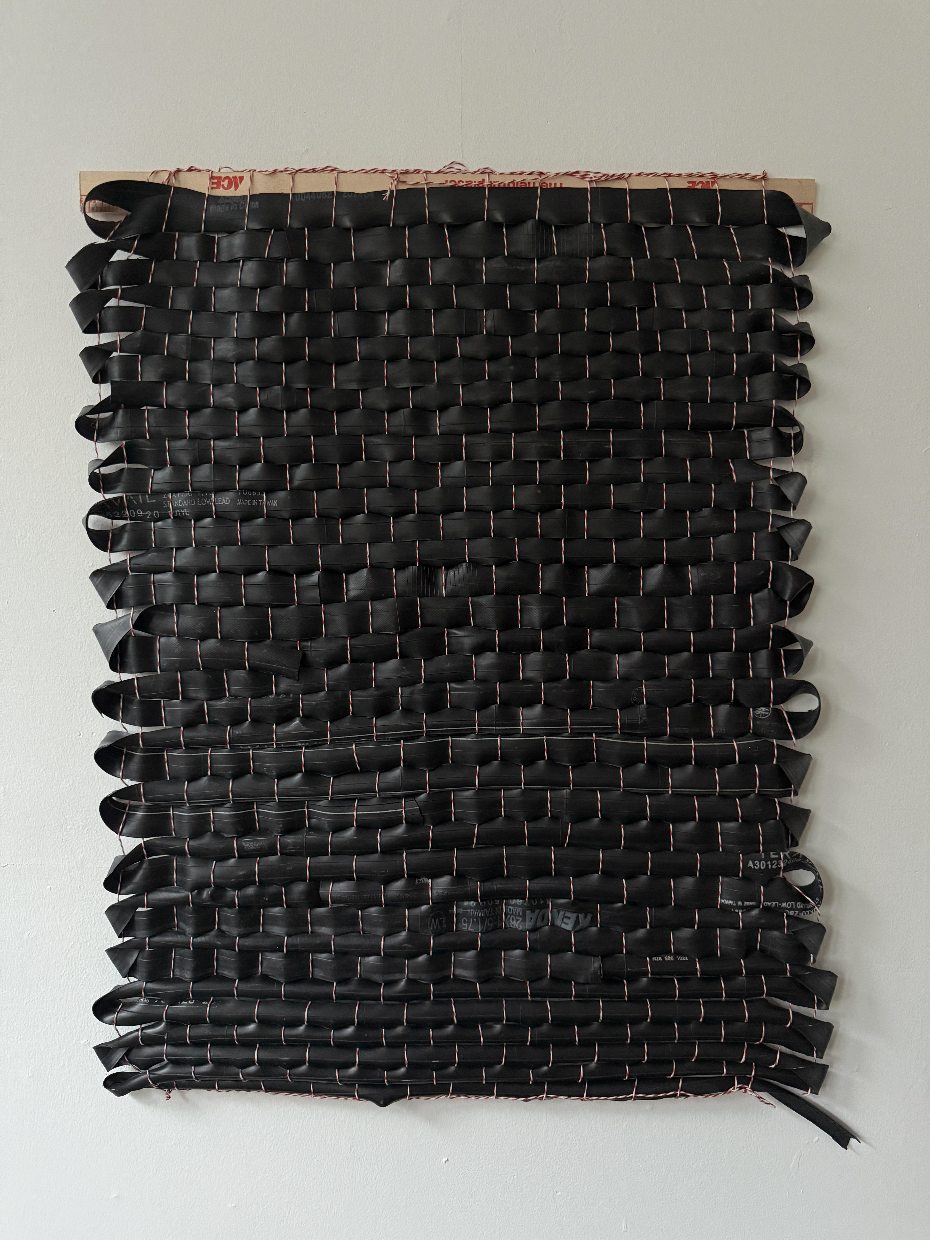 Weavings from discarded bike tubes, created with DIY picture frame looms.